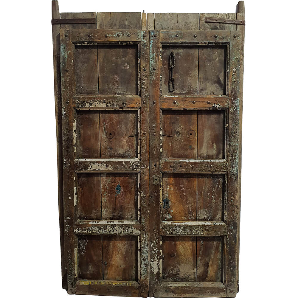 Diese alte Holztür ist ein Stück Architektur mit Seele, Patina und einem Hauch von Geheimnis. Mit ihrer massiven Konstruktion, den groben Eisenbeschlägen und den wunderschönen Spuren früherer Farbschichten hat sie irgendwo auf der Welt ihren Dienst getan – während der Alltag und Geschichten an ihr vorbeizogen.