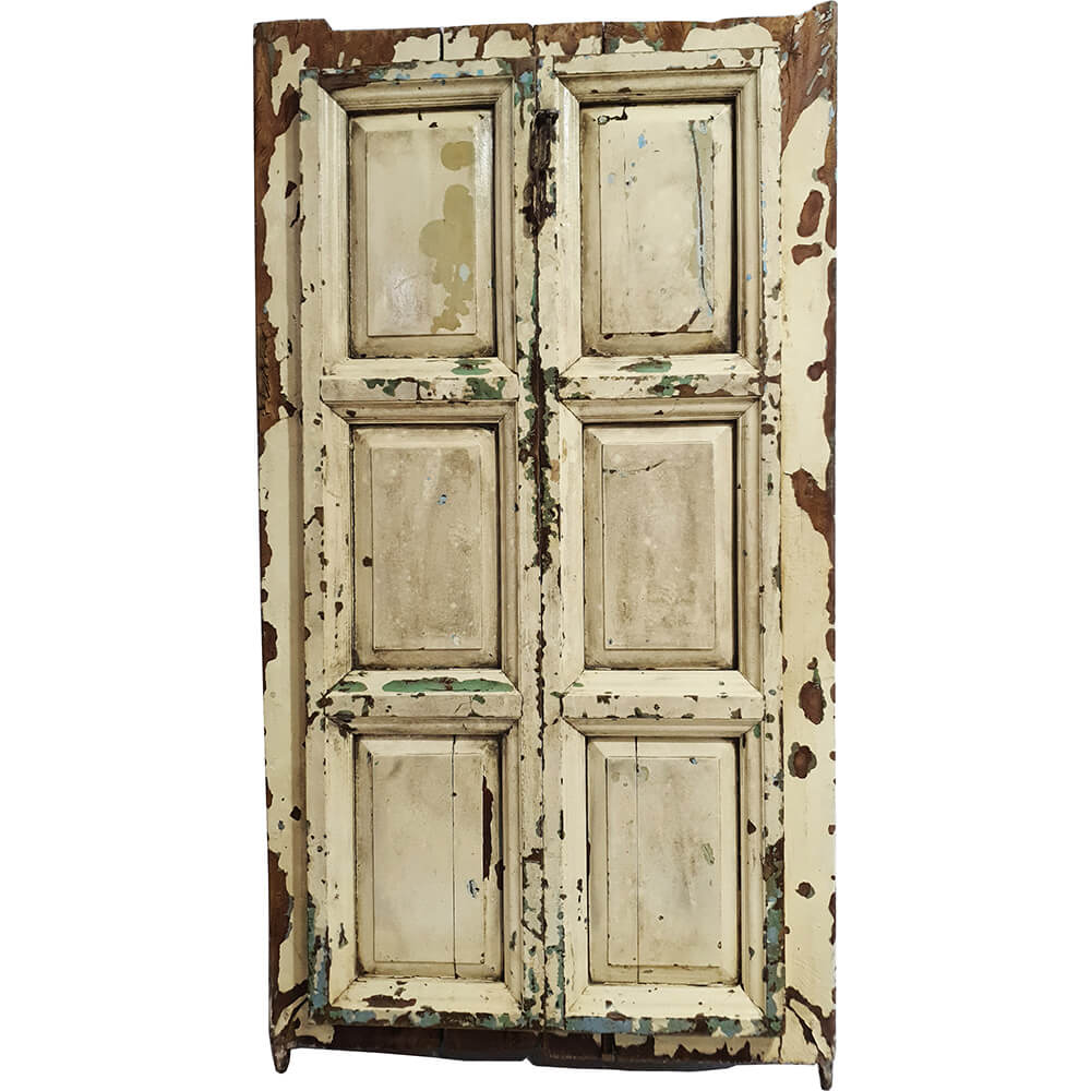 Diese wunderschöne Holztür in gedämpftem Cremeweiß hat offensichtlich ein langes und farbenfrohes Leben hinter sich. Die abgeblätterte Farbe gibt den Blick frei auf frühere Zeiten und Farbtöne – ein Look, der nicht nachgemacht, sondern nur durch Zeit und Nutzung entstehen kann.