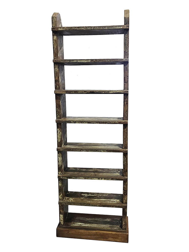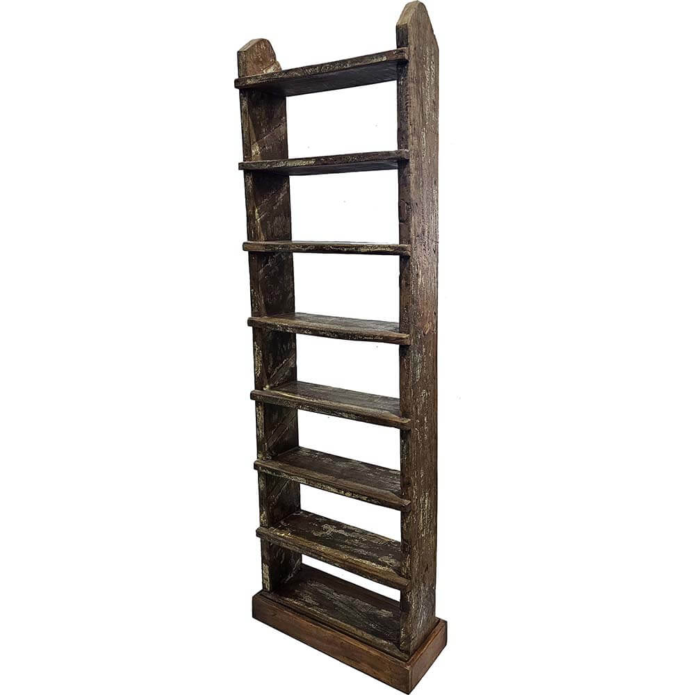 Hier finden Sie ein hohes, schlankes und charaktervolles Regal, das früher einmal als Treppe in Indien diente. Jetzt präsentiert es sich als Regal mit sieben praktischen Ablageflächen und einer ordentlichen Portion Patina. Das Regal ist aus massivem Holz gefertigt und besitzt eine schöne dunkle Oberfläche mit Gebrauchsspuren, Farbspritzern und Abnutzung – all das verleiht ihm seinen rauen Charme. Dank des stabilen Sockels steht es sicher, und die Abstände zwischen den Ablagen bieten Platz für Bücher, Dekoration, Gläser oder was immer Sie zur Schau stellen möchten.