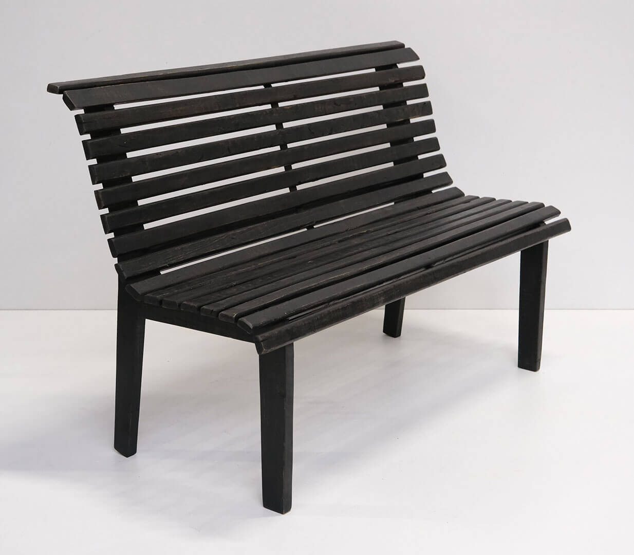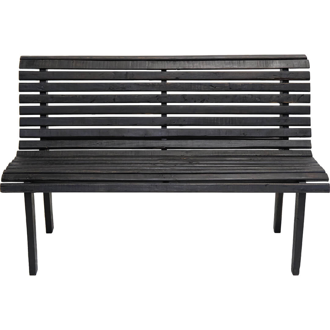Ultra schöne Bank aus schwarz lackiertem Altholz. Die Bank ist in einem sehr einfachen Stil gestaltet, der mit seiner hohen, geschwungenen Rückenlehne und Lamellen sowohl auf der Sitzfläche als auch auf der Rückenlehne organisch wirkt. Sie wird ein wunderbarer Blickfang im Schaufenster, im Restaurant oder zu Hause in der Eingangshalle. Eine wirklich schöne Bank mit vielen Einsatzmöglichkeiten.
