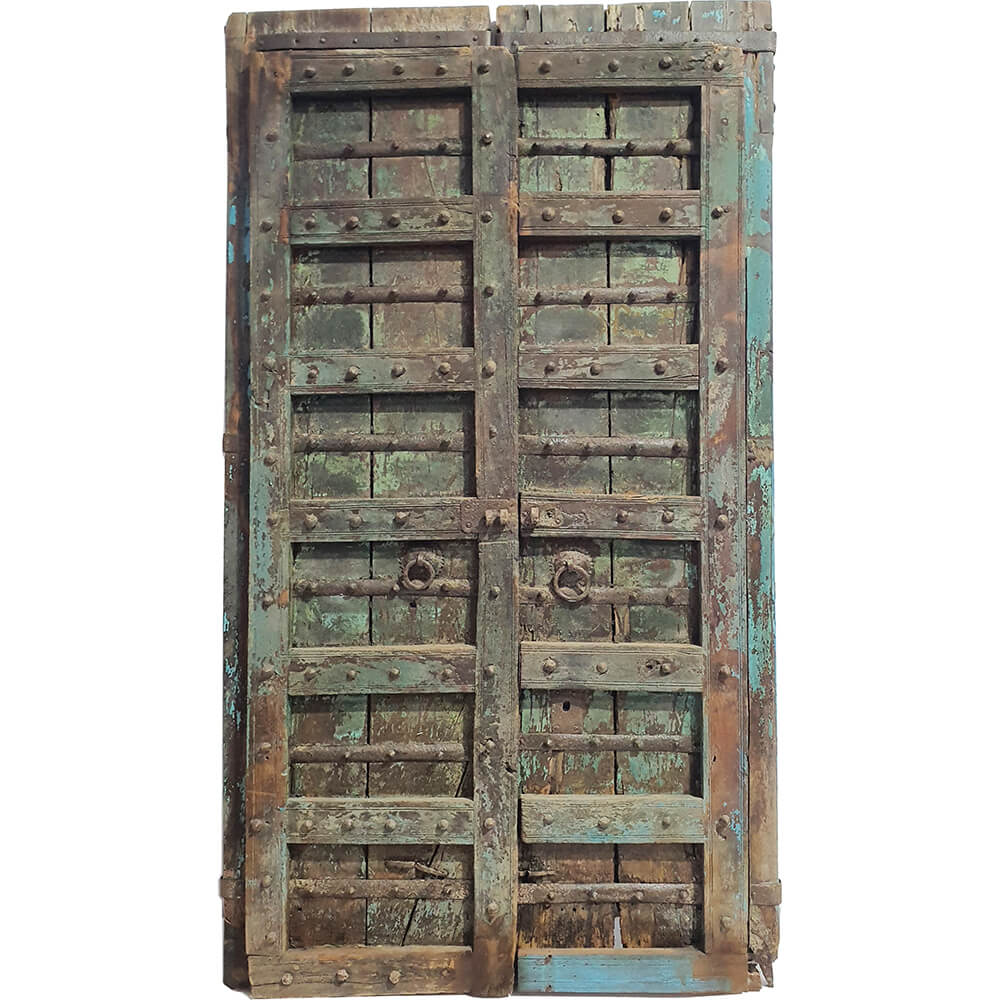 Diese doppelte Tür ist nicht einfach nur alt. Sie ist rau, authentisch und voller Charakter. Die blaugrünen Farbtöne, die zwischen den Schichten der Zeit hervorscheinen, bilden eine lebendige Patina, die man nicht nachahmen kann. Jeder Riss, jedes Nagelkopf und jede abgeblätterte Farbstelle erzählt eine Geschichte von Leben, Wetter und Funktion. Die kräftigen Holzlamellen und soliden Beschläge zeugen von handwerklichem Können, während die Ringgriffe und sichtbaren Querstreben der Tür eine fast dramatische Wirkung verleihen.