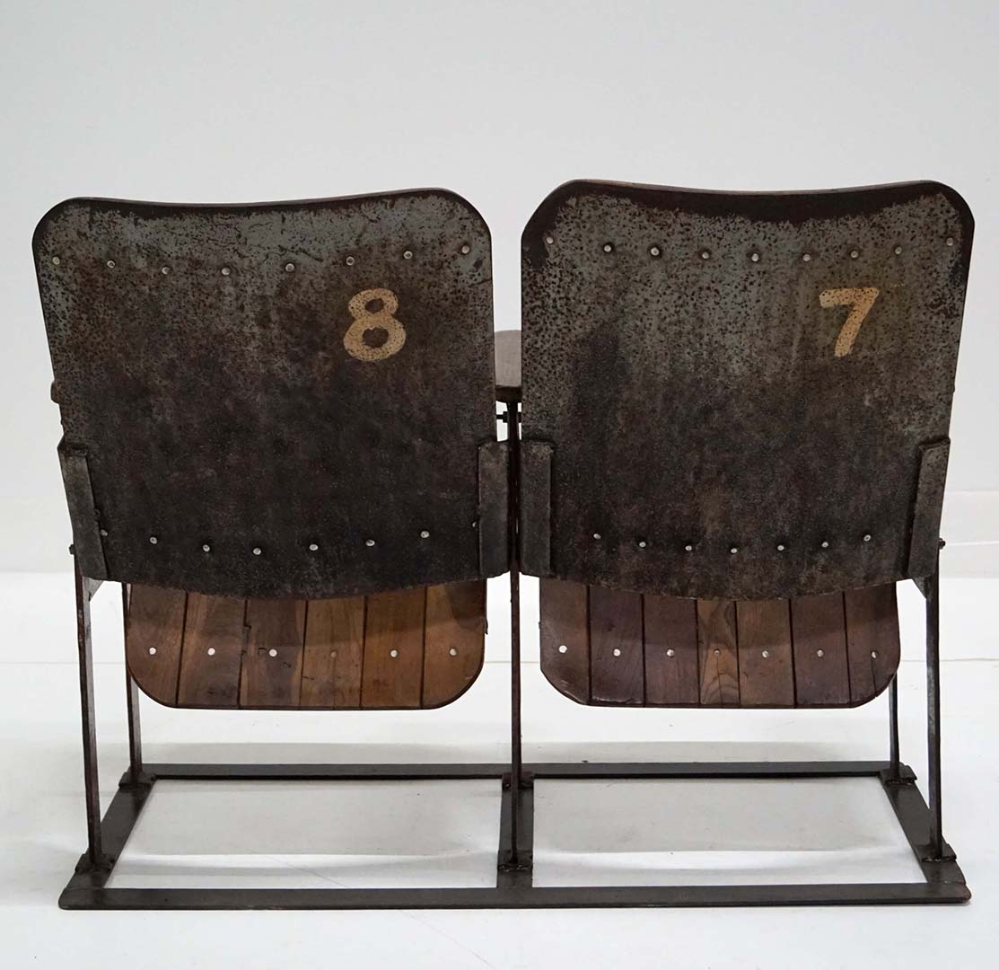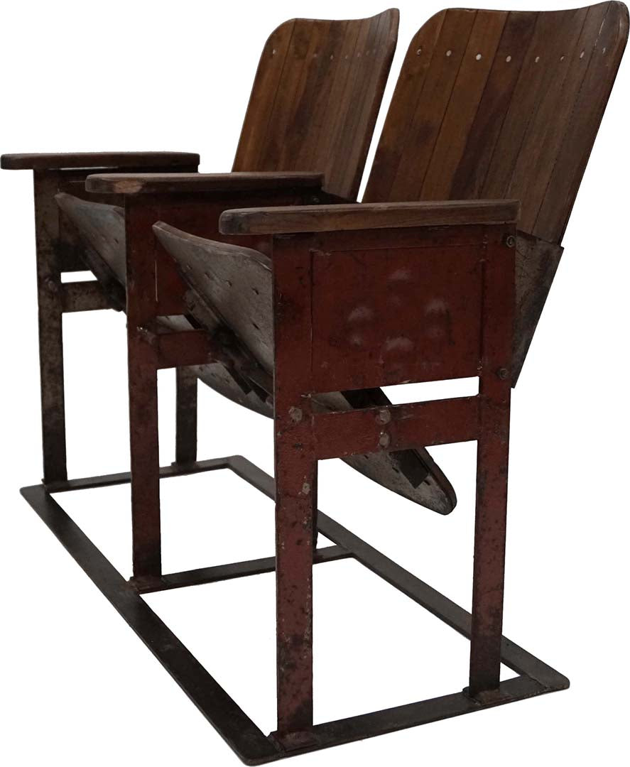 Eine authentische und charmante Kinobank mit 2 Sitzen, die vom Lauf der Zeit geprägt und voller Geschichte ist. Die Sitze bestehen aus massiven Holzlamellen mit einer wunderschönen Patina, während der Rahmen aus Metall gefertigt ist und ein industrielles, rustikales Flair verleiht. Diese Bank ist eine perfekte Kombination aus Funktionalität und Nostalgie – ideal für alle, die ein Möbelstück mit Persönlichkeit suchen. Die Armlehnen und das klassische Design machen die Bank komfortabel, während ihr abgenutzter Look Charakter und Wärme in den Raum bringt. Verwenden Sie sie als auffälliges Detail im Eingangsbereich, als Sitzgelegenheit in einem Geschäft oder Café oder als einzigartiges Element in einer gemütlichen Ecke Ihres Zuhauses. Ein Möbelstück, das Geschichte in jede Einrichtung bringt