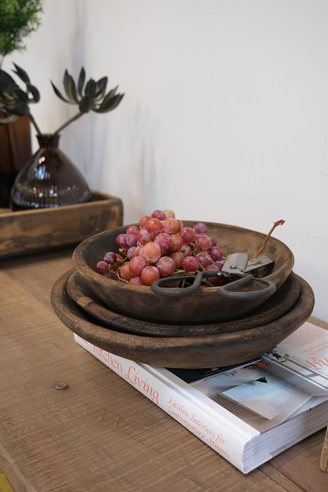 Dieses Sortiment alter Rizwan-Holzschalen hat ein langes und bewegtes Leben hinter sich. Jede Schale ist aus Holz handgeschnitzt und trägt deutliche Spuren von Gebrauch, Patina und traditioneller Handwerkskunst. Mit einem Durchmesser von ca. 20–30 cm variieren sie in der Form, Farbe und Oberfläche, sodass jedes Stück seinen ganz eigenen Ausdruck hat.