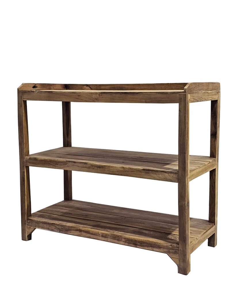 Dieses schöne Regal aus Holz bietet drei geräumige Ablageflächen und ein schlichtes, funktionales Design mit viel Wärme. Jedes Regal ist ein Unikat. Struktur und Farbe können variieren. Genau wie es sein soll, wenn das Material auf natürliche Weise gealtert ist.