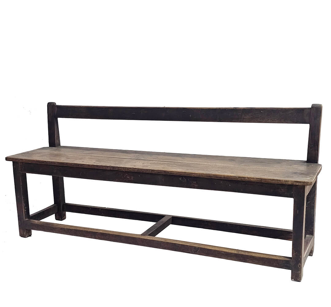 Schlichtes Design, ehrliche Materialien und jede Menge Geschichte. Diese alte Holzbank hat einen charmant abgenutzten Look und eine niedrige Rückenlehne, die ihr eine leichte und unaufdringliche Ausstrahlung verleiht. Sie ist solide gebaut und zeugt von einer Zeit, in der Dinge für die Ewigkeit gemacht wurden.