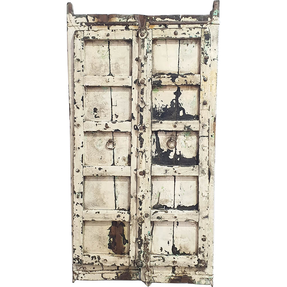 Diese weiße, alte Holztür ist ein echter Schatz für alle, die Möbel und Interieur mit Geschichte und Charakter lieben. Die Tür zeigt deutliche Spuren von Abnutzung und Gebrauch, die ihren Charme nur noch verstärken. Die Farbe ist an mehreren Stellen abgeplatzt und gibt Schichten früherer Farben frei – all das verleiht der Tür eine wunderbar lebendige Patina. Kleine Eisenringe, dekorative Beschläge und markante Holzrahmen erzählen die Geschichte eines Handwerksstücks, das einst sowohl funktional als auch bedeutungsvoll war.